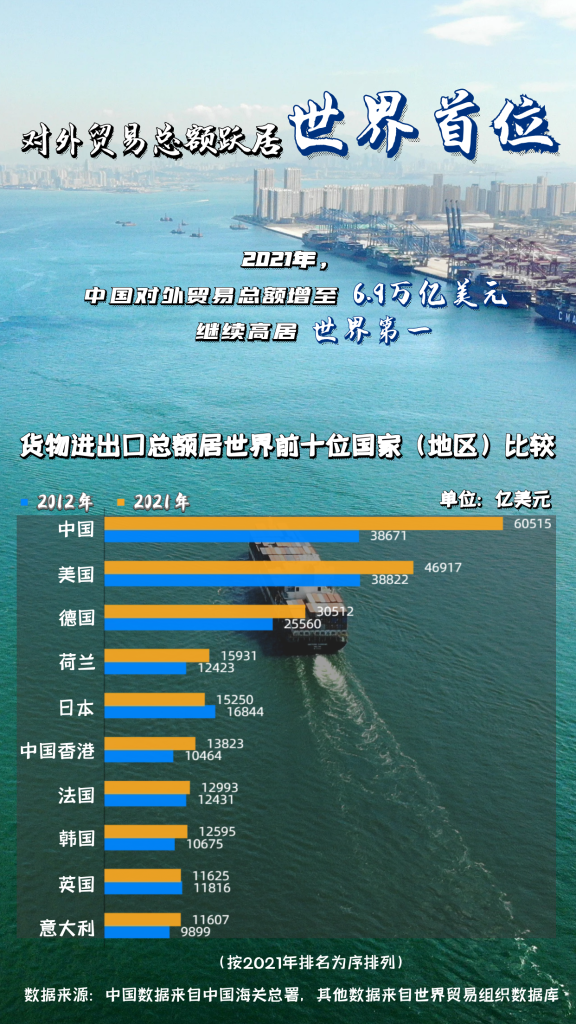 2020年中國對外貿(mào)易總額由2012年的4.4萬億美元升至5.3萬億美元,首超美國成為全球第一大貿(mào)易國。2021年,中國對外貿(mào)易總額加快上升增至6.9萬億美元,繼續(xù)高居世界第一。在經(jīng)濟全球化頻遭單邊主義、保護主義等“逆流”襲擾的歷史當(dāng)口,中國從融入和適應(yīng)全球化走向推動和引領(lǐng)全球化,積極倡導(dǎo)建設(shè)開放型世界經(jīng)濟,推動經(jīng)濟全球化朝著更加開放、包容、普惠、平衡、共贏方向發(fā)展。目前,中國已成為140多個國家和地區(qū)的主要貿(mào)易伙伴,形成更大范圍、更寬領(lǐng)域、更深層次對外開放格局。