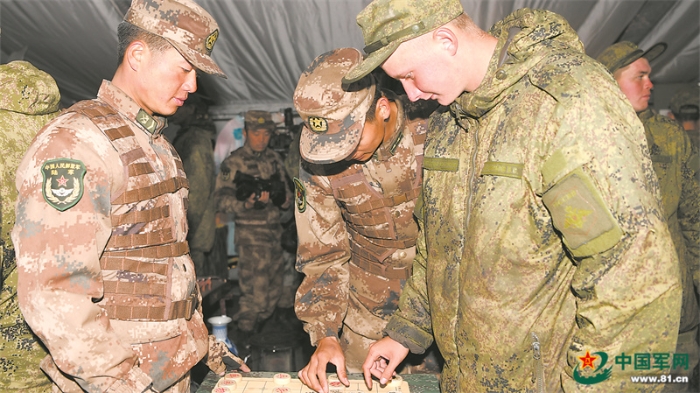有幾個細(xì)節(jié),讓筆者一直記憶猶新。參演官兵是和平的捍衛(wèi)者,也是友誼的傳遞者。握手、擁抱和合影,是聯(lián)演期間各國官兵之間最頻繁、最生動和最溫暖的畫面。“東方-2018”戰(zhàn)略演習(xí)文化交流和慰問演出中,《莫斯科郊外的晚上》讓兩國官兵的互動交流達(dá)到一個小高潮,語言的隔閡與文化的差異在動人的旋律中消融。中俄兩軍官兵圍坐一起,雙方吹奏起《月光下的鳳尾竹》《喀秋莎》,韻律婉轉(zhuǎn)流淌。文化體驗館中,俄羅斯士兵與中國士兵一起在蛋殼上雕刻出“友誼萬歲”四個漢字。巨幅米貼畫“祖國在我心中”,中國官兵邀請俄軍官兵一同用各色各樣的米粒貼出中國版圖……