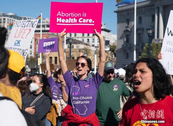資料圖:6月24日,美國舊金山民眾聚集在市政廳前,抗議美聯(lián)邦最高法院推翻羅訴韋德案。中新社記者 劉關(guān)關(guān) 攝