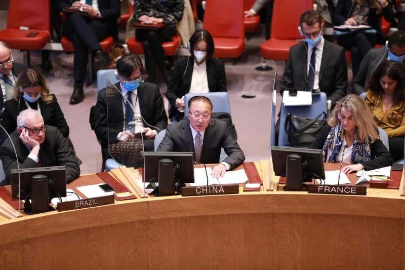 4月5日,在位于紐約的聯(lián)合國總部,中國常駐聯(lián)合國代表張軍(前排中)在安理會(huì)烏克蘭局勢公開會(huì)上闡述中方關(guān)于當(dāng)前烏克蘭局勢的立場主張,強(qiáng)調(diào)推動(dòng)烏克蘭局勢降級,盡早?;鹬箲?zhàn),是國際社會(huì)的迫切期待,也是中方的強(qiáng)烈愿望。新華社記者謝鍔攝