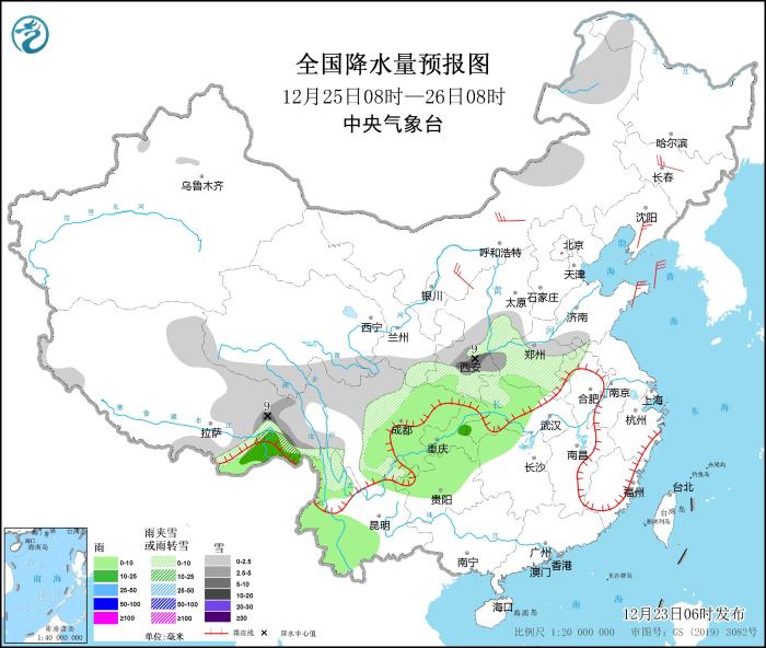 12月25日08時至26日08時,內蒙古東北部、西藏東部、青海南部、甘肅南部、陜西中南部、山西南部、河南中南部、川西高原等地部分地區(qū)有小到中雪或雨夾雪,其中,陜西中部、西藏東部等地局地有大雪(5~9mm)。西藏東南部、湖北西部、湖南西北部、西南地區(qū)東部和南部等地部分地區(qū)有小到中雨。內蒙古中西部、東北地區(qū)中南部、山東半島等地部分地區(qū)有4~5級風。