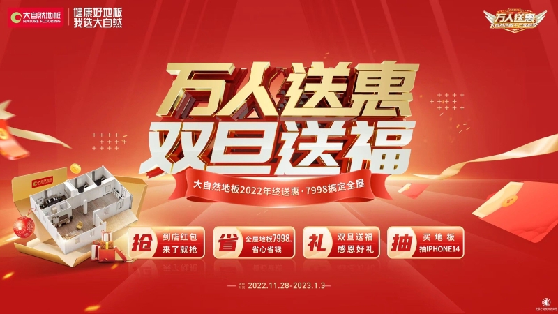 隨著全國疫情逐漸放松,不僅加速家居產(chǎn)業(yè)的洗牌,快速實(shí)現(xiàn)優(yōu)勝劣汰,也將為廣大家居企業(yè)帶來新一輪的品牌突圍契機(jī)。大自然地板更是在12月謀篇布局,推出“萬人送惠 雙旦送福”全國營銷活動,線上、線下花式營銷火熱進(jìn)行中,全國主動出擊搶訂單、拓市場,為家居消費(fèi)市場注入新的活力與生機(jī)。