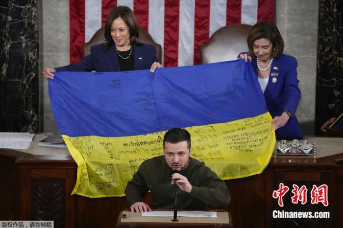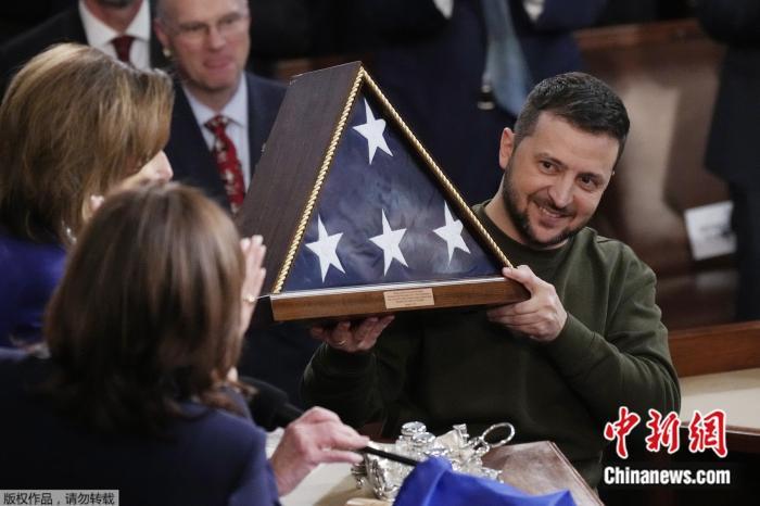 澤連斯基在美國國會講話感謝“東道主”,呼吁提供更多援助,并繼續(xù)制裁俄羅斯。他還向國會贈送了一面由烏東前線城市巴赫穆特士兵簽名的烏國旗,眾議長佩洛西則回贈一面放在三角形盒子里的美國國旗。