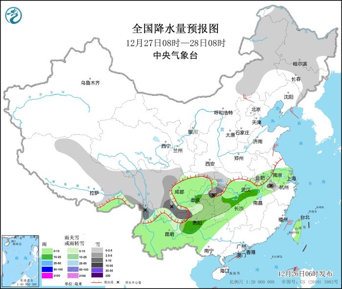 12月27日08時至28日08時,內(nèi)蒙古東部、黑龍江和吉林大部、西藏東部、湖北西部、湖南西部、貴州中北部、重慶東南部、川西高原、云南北部以及安徽大別山區(qū)和皖南山區(qū)等地部分地區(qū)有小到中雪,其中,安徽皖南山區(qū)、湖北西南部、川西高原南部、重慶東南部、貴州西北部、云南北部等地部分地區(qū)有大到暴雪(10~15毫米)。湖北中東部、湖南中東部、安徽南部、江蘇南部、浙江北部、江西西北部、廣西中西部、云南中南部、臺灣島等地部分地區(qū)有小到中雨。內(nèi)蒙古中部、河北北部部分地區(qū)有4~5級風(fēng)。東海南部海域、臺灣海峽、巴士海峽、南海大部海域、北部灣將有6~7級、陣風(fēng)8級的偏北或東北風(fēng),其中臺灣海峽、南海東北部的部分海域風(fēng)力可達(dá)8級、陣風(fēng)9級(見圖2)。