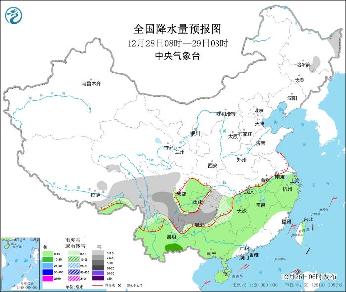 圖2 全國降水量預(yù)報圖(12月27日08時-28日08時)