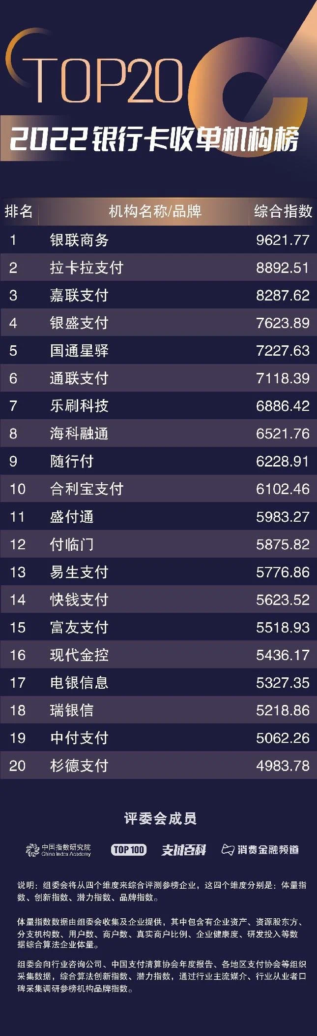 「2022銀行卡收單機(jī)構(gòu)TOP20榜」