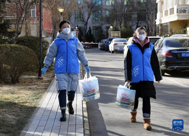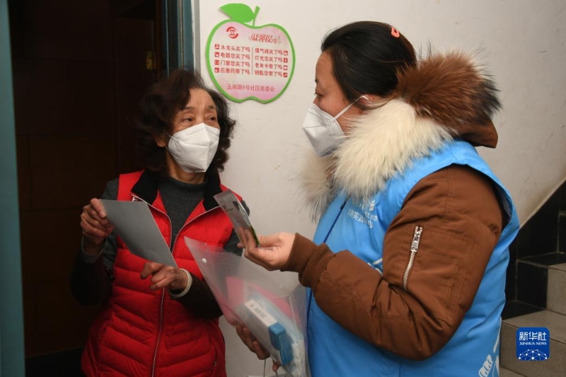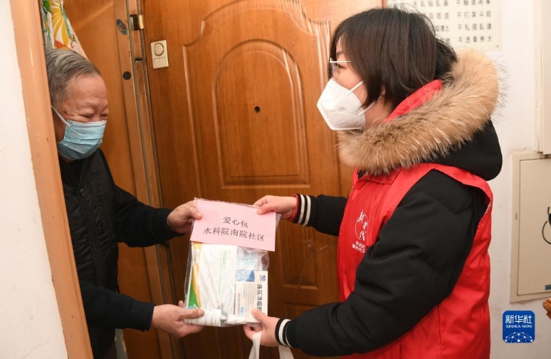 12月27日,在北京市海淀區(qū)羊坊店街道玉南路9號(hào)社區(qū),社區(qū)工作人員為老人送“防疫愛(ài)心包”。
