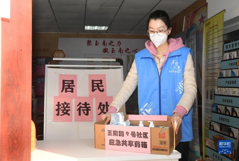 12月27日,在北京市海淀區(qū)羊坊店街道玉南路9號(hào)社區(qū)居委會(huì),工作人員將“共享藥箱”放置在門(mén)口。