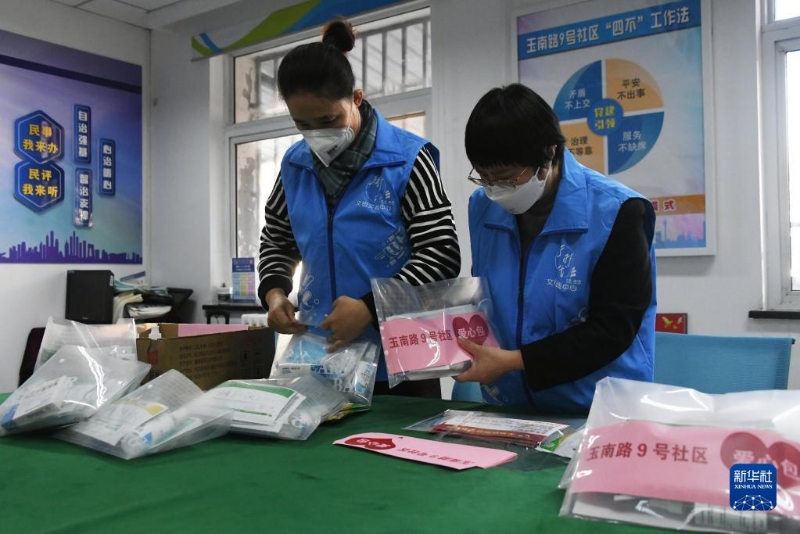12月27日,在北京市海淀區(qū)羊坊店街道玉南路9號(hào)社區(qū)居委會(huì),社區(qū)工作人員在裝“防疫愛(ài)心包”。