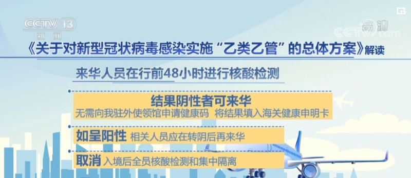 按照《總體方案》要求,來華人員在行前48小時進行核酸檢測,結果陰性者可來華,無需向我駐外使領館申請健康碼,將結果填入海關健康申明卡。如呈陽性,相關人員應在轉(zhuǎn)陰后再來華;取消入境后全員核酸檢測和集中隔離。健康申報正常且海關口岸常規(guī)檢疫無異常者,可放行進入社會面;取消“五個一”及客座率限制等國際客運航班數(shù)量管控措施;各航空公司繼續(xù)做好機上防疫,乘客乘機時須佩戴口罩;進一步優(yōu)化復工復產(chǎn)、商務、留學、探親、團聚等外籍人士來華安排,提供相應簽證便利。逐步恢復水路、陸路口岸客運出入境。根據(jù)國際疫情形勢和各方面服務保障能力,有序恢復中國公民出境旅游。