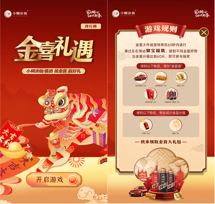 “開蓋見金喜”作為小糊涂仙·醬酒2023新年新春活動(dòng),以趣味視頻的方式把48888元購車基金、19999元幸福生活消費(fèi)基金、2g金條等千萬“金喜”活動(dòng)福利信息通過各社交平臺(tái)傳播,引發(fā)廣大消費(fèi)者關(guān)注,同時(shí)還上線“幸運(yùn)大挑戰(zhàn)”h5小游戲激發(fā)大眾參與,幸運(yùn)者更可獲得驚喜獎(jiǎng)品一份。