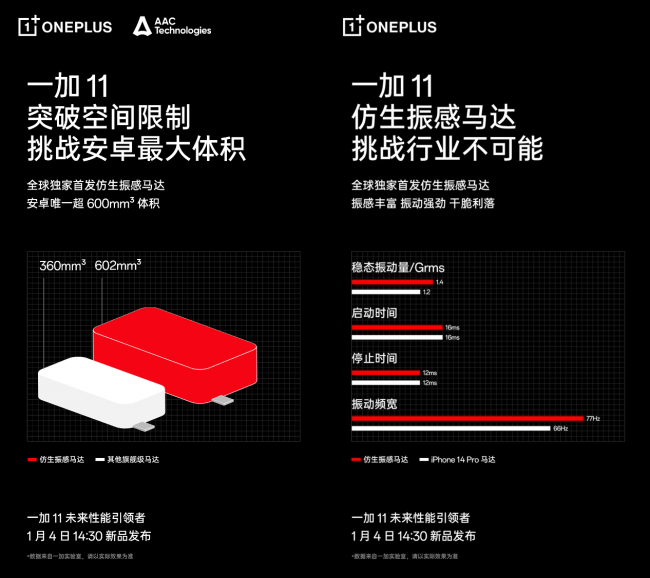 早在2019年,一加便與瑞聲科技聯(lián)合為一加 7 Pro定制當(dāng)時(shí)安卓手機(jī)里尺寸最大、性能最強(qiáng)、響應(yīng)最快的橫向線性馬達(dá),刷新用戶對(duì)安卓馬達(dá)的認(rèn)知。此后一加歷代性能旗艦均搭載行業(yè)領(lǐng)先馬達(dá)。頂級(jí)馬達(dá)體驗(yàn)已融入一加的性能基因,此次獨(dú)家搭載仿生振感馬達(dá)的一加 11 將成為手機(jī)馬達(dá)新標(biāo)桿。