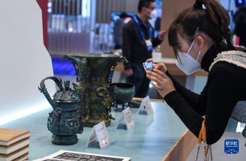 12月29日,參觀者在中國國家版本館展區(qū)拍攝文創(chuàng)產(chǎn)品。