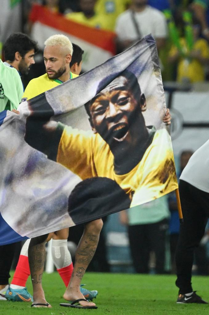12月5日,巴西隊(duì)球員在卡塔爾世界杯八分之一決賽后打出祝福“球王”貝利的橫幅。新華社記者 李尕 攝