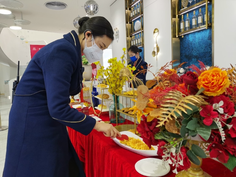客服人員在茶歇區(qū)提供茶點(diǎn)美食