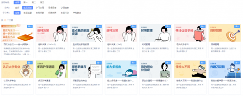 在設(shè)計(jì)生涯內(nèi)容期間,升學(xué)e網(wǎng)通將內(nèi)容細(xì)分為“生涯喚醒”、“自我探索”、“探索世界”、“生涯行動(dòng)”、“學(xué)科融合”五個(gè)類別。幫助學(xué)生認(rèn)知自我,發(fā)展和提升綜合素養(yǎng)與能力,同時(shí)實(shí)現(xiàn)全面而有個(gè)性發(fā)展,也為學(xué)生后續(xù)的分班選科、學(xué)業(yè)規(guī)劃、以及將來高考的志愿填報(bào)、大學(xué)專業(yè)選擇做好充分準(zhǔn)備。