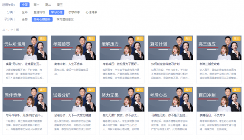 班會(huì)課分為:生涯規(guī)劃、學(xué)習(xí)心理、思想品德、心理健康四個(gè)版塊,屆時(shí)可為高一、高二、高三各個(gè)年級(jí)提供不同的個(gè)性化內(nèi)容。