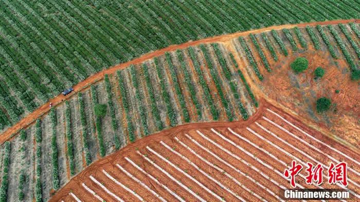 航拍位于吳城水庫之畔的江西樟樹義成鎮(zhèn)黃梔子種植基地。姜濤 攝