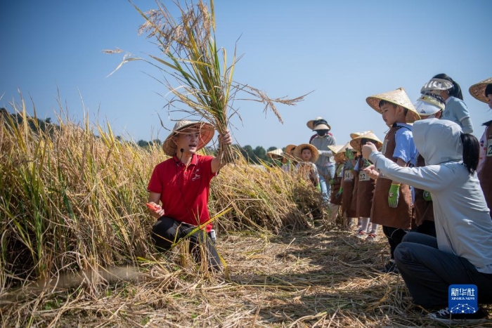 10月18日,小朋友在“一心回鄉(xiāng)”生態(tài)農(nóng)場體驗收割稻谷。新華社記者 伍志尊 攝