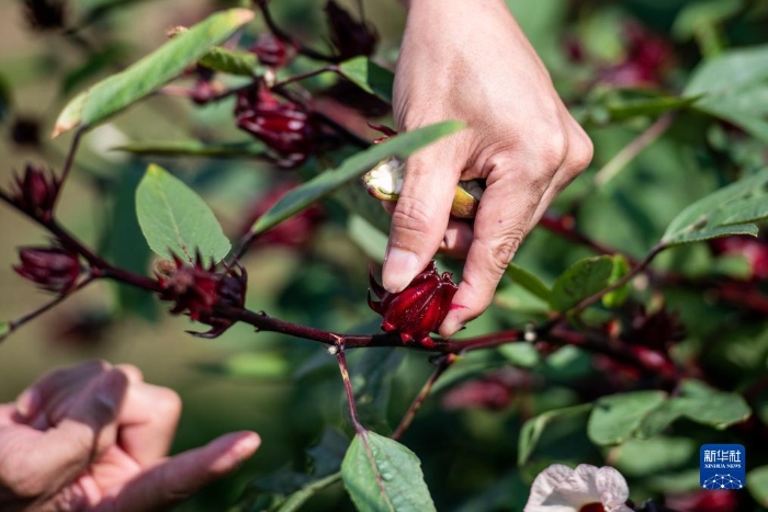 10月18日,蔡三益在查看洛神花長勢。新華社記者 伍志尊 攝