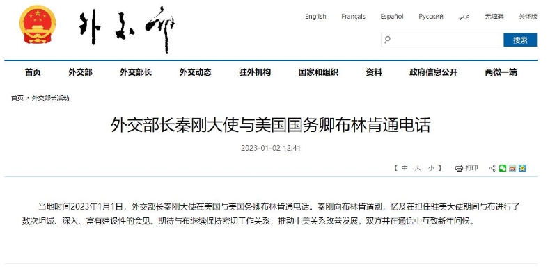 當?shù)貢r間2023年1月1日,外交部長秦剛大使在美國與美國務卿布林肯通電話。秦剛向布林肯道別,憶及在擔任駐美大使期間與布進行了數(shù)次坦誠、深入、富有建設性的會見。期待與布繼續(xù)保持密切工作關系,推動中美關系改善發(fā)展。雙方并在通話中互致新年問候。
