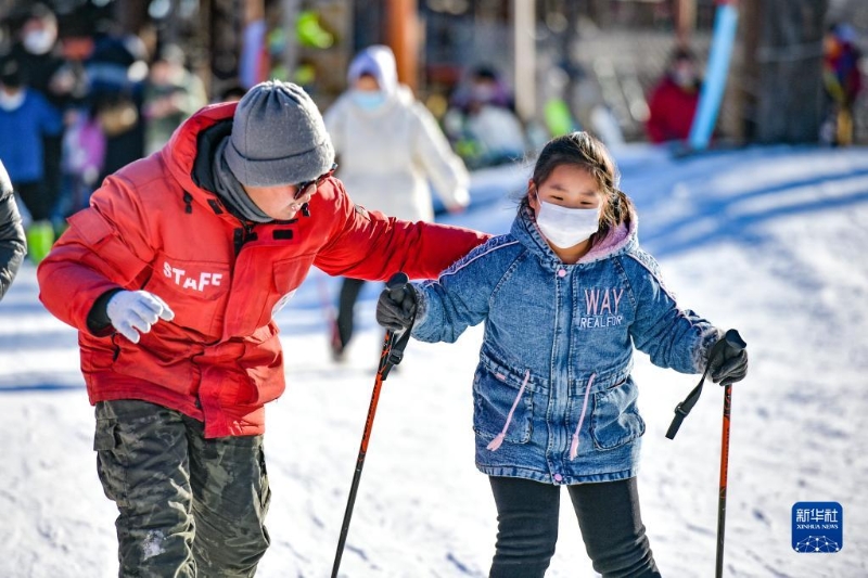 1月2日,在天津市薊州區(qū)一主題樂園,小朋友在教練的陪同下體驗初級滑雪。