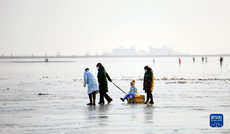 1月2日,游客河北唐山海港經(jīng)濟開發(fā)區(qū)海灘的冰面上游玩。