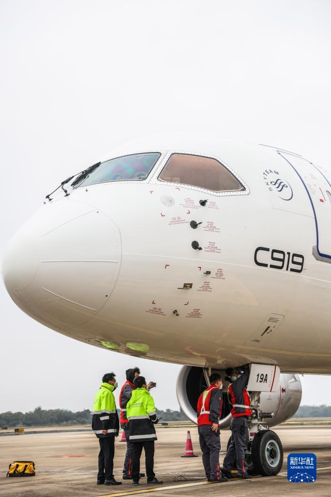 1月2日,海口美蘭國際機(jī)場的機(jī)務(wù)人員對國產(chǎn)大飛機(jī)C919進(jìn)行落地檢查。