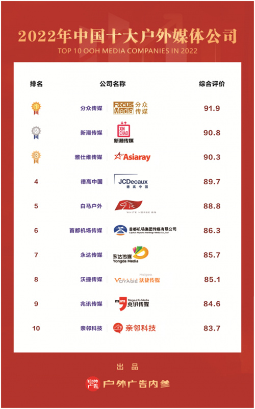 以上便是《2022年中國十大戶外媒體公司排行榜》的介紹,具體的榜單實(shí)物證書、獎牌,我們會在2023年上半年于長沙舉辦的“金璧獎&中國戶外媒體創(chuàng)新大會”上頒發(fā)。