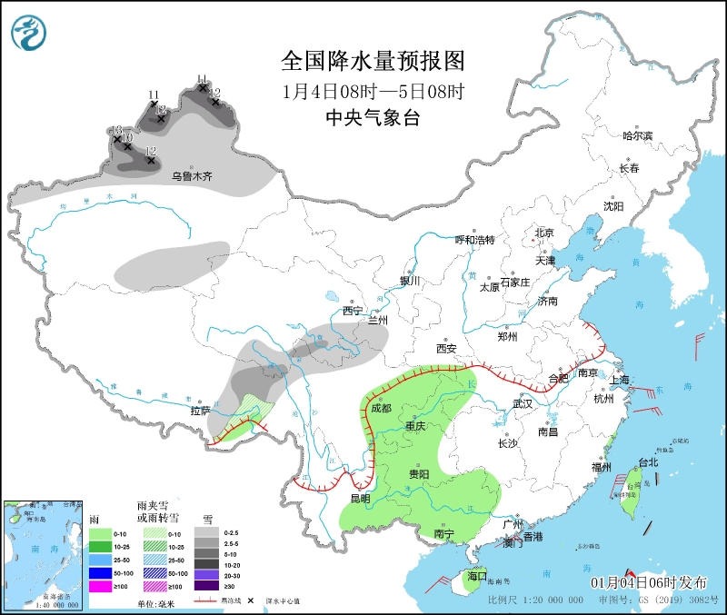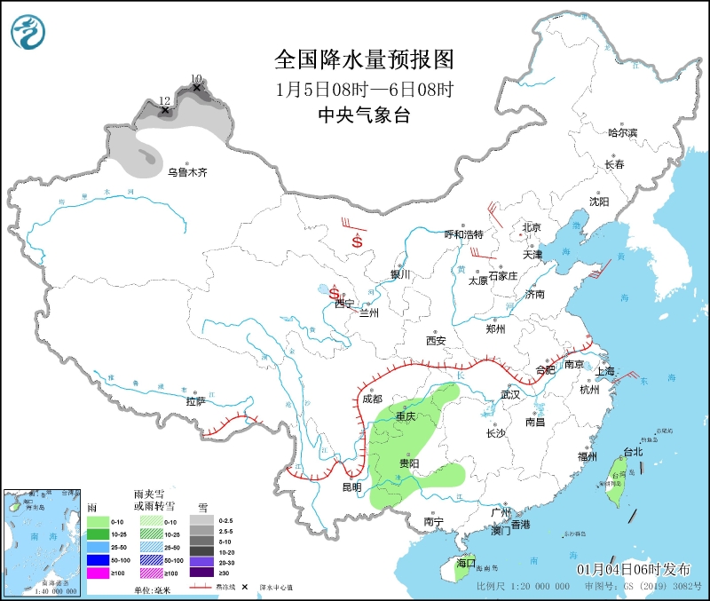 1月4日08時至5日08時,新疆北部、西藏東部、青海東南部等地部分地區(qū)有小到中雪或雨夾雪,其中,新疆塔城、阿勒泰和伊犁河谷等地部分地區(qū)有大到暴雪(10~13毫米)。湖北西部、四川盆地、重慶、貴州中西部、云南東部、廣西、海南島東部、臺灣島等地部分地區(qū)有小雨。東海南部海域、臺灣海峽、臺灣以東洋面、巴士海峽、南海大部海域?qū)⒂?~8級、陣風(fēng)9級的東北風(fēng)。