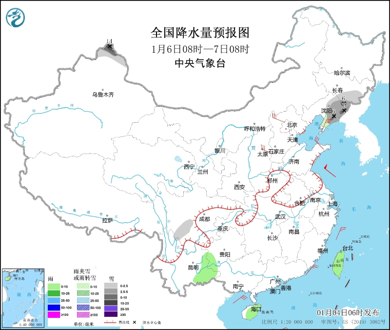 1月6日08時至7日08時,新疆北疆北部、吉林南部、遼寧中東部、川西高原南部等地部分地區(qū)有小到中雪或雨夾雪,其中,新疆北疆北部、遼寧東部等地部分地區(qū)有大到暴雪(10~14毫米)。貴州西南部、云南東部、海南島中東部、臺灣島等地部分地區(qū)有小雨。遼東半島、山西中部、河北北部、山東半島等地部分地區(qū)有5~6級風(fēng)。渤海海峽、黃海大部海域、東海大部海域、臺灣海峽、臺灣以東洋面、巴士海峽、南海大部海域、北部灣將有6~8級、陣風(fēng)9級的東北風(fēng)。