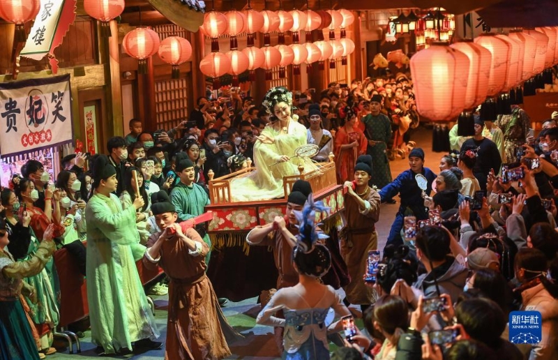 2022年12月31日,游客在陜西西安長安十二時辰主題街區(qū)觀看表演。