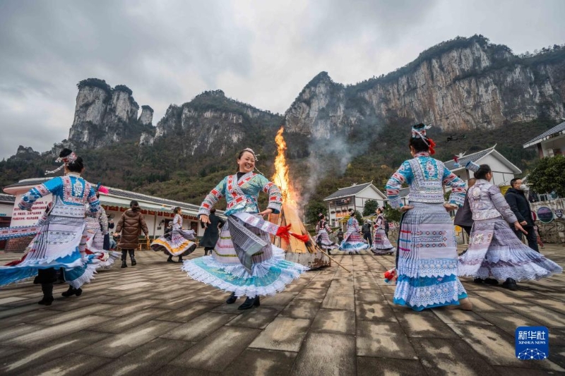 1月2日,游客在貴州省黔西市新仁苗族鄉(xiāng)化屋村和苗族同胞一起圍著篝火跳舞。