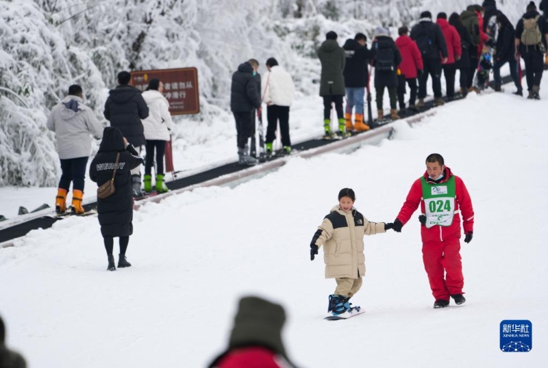 1月1日,在重慶市南川區(qū)金佛山景區(qū)滑雪場,一名小游客在雪場教練的指導下練習滑雪。