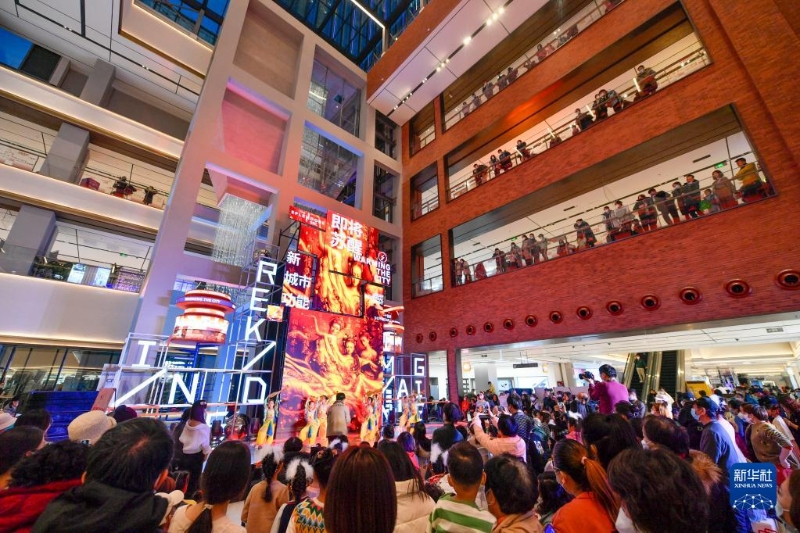 1月1日,市民在天津金茂匯商場內觀看演出。