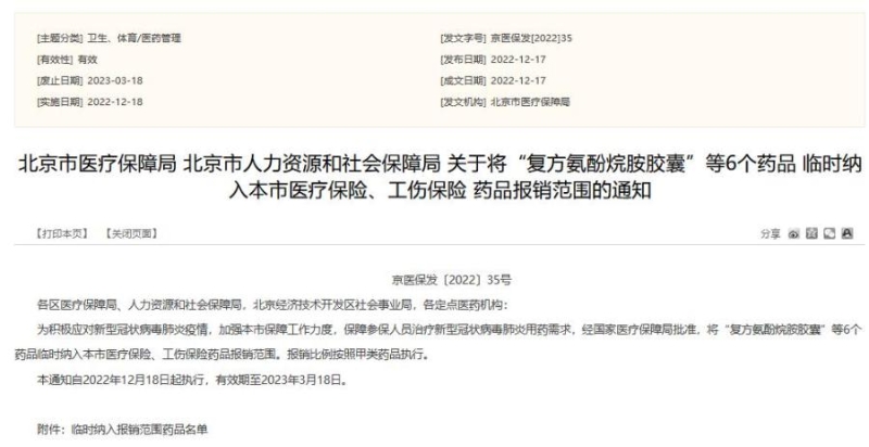 北京市醫(yī)療保障局網(wǎng)站2022年12月17日發(fā)布消息,為積極應(yīng)對新型冠狀病毒肺炎疫情,加強北京市保障工作力度,保障參保人員治療新型冠狀病毒肺炎用藥需求,經(jīng)國家醫(yī)療保障局批準,將復(fù)方氨酚烷胺膠囊、復(fù)方氨酚甲麻口服液、小兒氨酚黃那敏顆粒、氨咖黃敏膠囊、氯芬黃敏片、氨溴特羅口服溶液6個藥品臨時納入北京市醫(yī)療保險、工傷保險藥品報銷范圍。報銷比例按照甲類藥品執(zhí)行。通知自2022年12月18日起執(zhí)行,有效期至2023年3月18日。