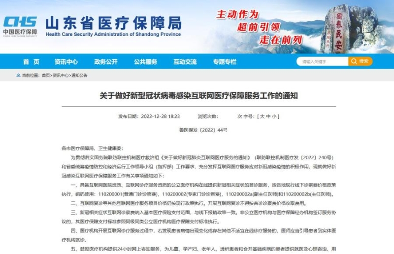 山東:新冠癥狀網(wǎng)上問診納入醫(yī)保報銷 與線下報銷政策一致