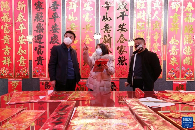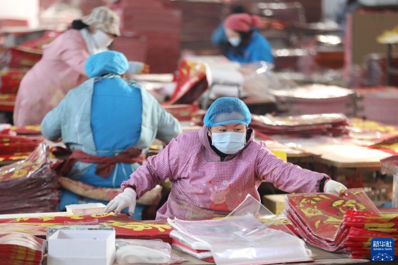 1月3日,焦作市溫縣岳村街道呂村村民在包裝春聯(lián)。