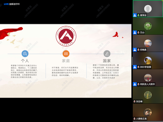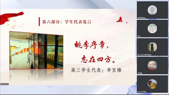 近日,人大附中朝陽學(xué)校高三年級“青春赤子國之棟梁”成人禮在線上隆重舉行。人大附中朝陽學(xué)校謝澤運(yùn)校長、鄧躍茂書記、閆艷晨副校長、楊正英副校長、李燕副校長、李梅副校長、劉云峰副校長、馮怡副校長、高傳利副校長、常淑霞副校長、代超副校長以及高三年級部全體師生和家長共同參與了這場青春的盛典,見證了這一激動(dòng)人心的時(shí)刻。本次活動(dòng)由高三年級主任助理王山、殷玥兩位老師擔(dān)任主持人。