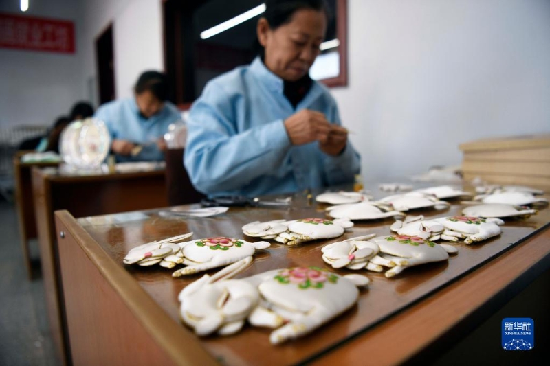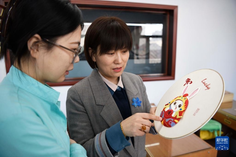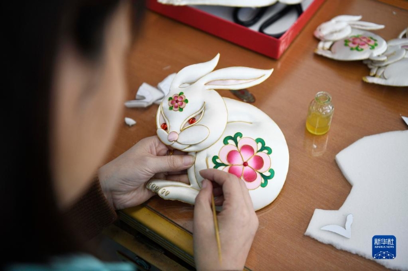 1月4日,在豐寧縣非遺布糊畫就業(yè)工坊,手工藝人在制作兔年主題布糊畫。