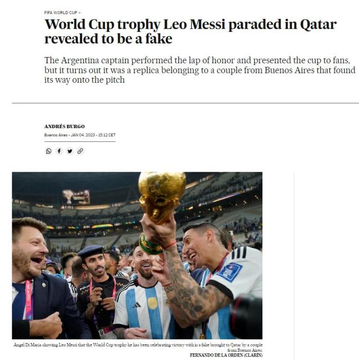 不過,西班牙《國家報》也指出,事實上,國際足聯(lián)主席因凡蒂諾交給梅西的真獎杯,也只在球場上短暫出現(xiàn)。在被梅西舉起不久后,真獎杯就被送回了瑞士國際足聯(lián)總部,取而代之的是一個官方復(fù)制品。