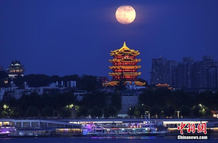 資料圖:一輪“超級月亮”從黃鶴樓旁緩緩升起。圖片來源:視覺中國