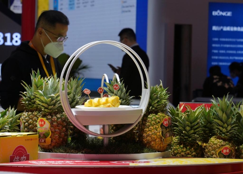 第五屆進(jìn)博會(huì)食品及農(nóng)產(chǎn)品展區(qū)拍攝的菲律賓黑鉆鳳梨。