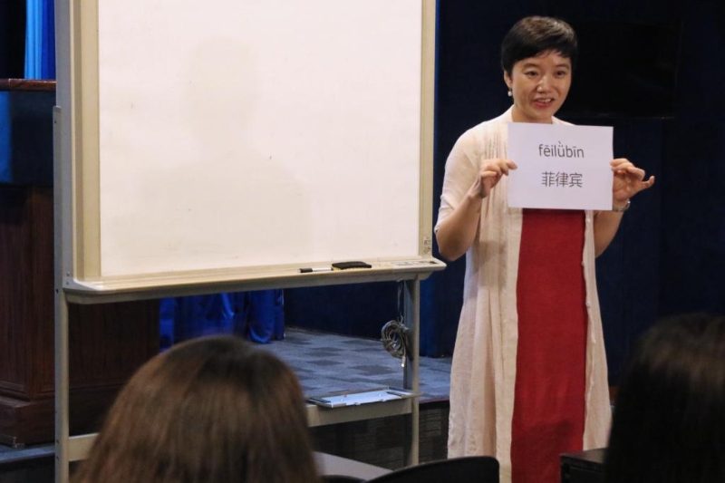 在菲律賓馬尼拉,菲律賓大學(xué)孔子學(xué)院的老師孟廣潔為菲律賓總統(tǒng)府新聞部工作人員上課。