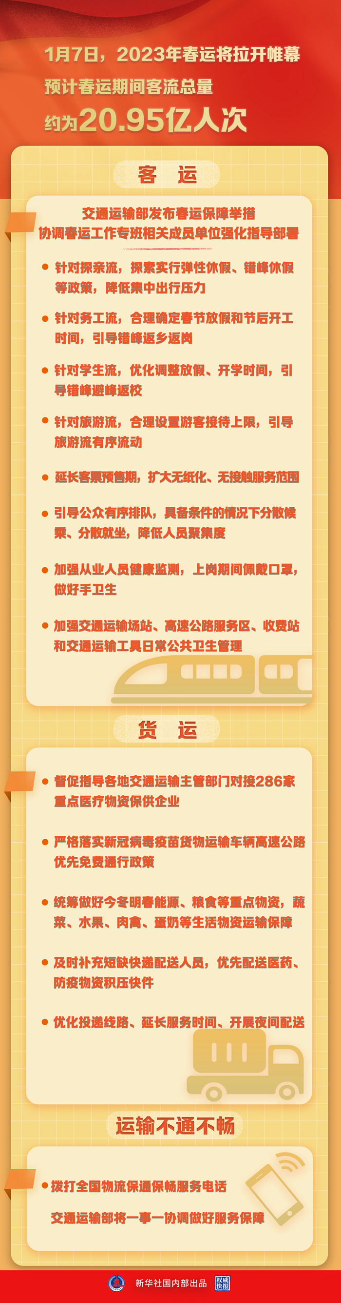 1月7日,2023年春運(yùn)將拉開帷幕,預(yù)計(jì)春運(yùn)期間客流總量約為20.95億人次,比去年同期增長99.5%,恢復(fù)到2019年同期的70.3%。春運(yùn)期間,交通運(yùn)輸部將扎實(shí)做好春運(yùn)疫情服務(wù)保障工作,確保交通物流平穩(wěn)有序。