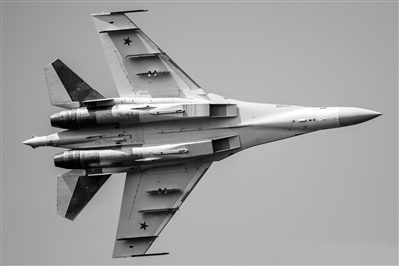 上圖:蘇-35戰(zhàn)機裝配兩側進氣道與矢量尾噴管。資料照片
