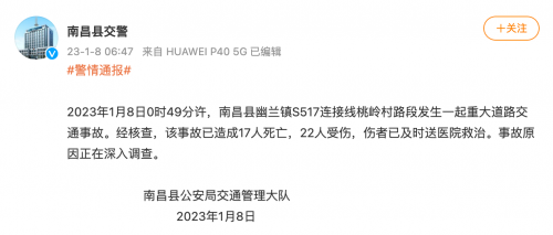 2023年1月8日0時(shí)49分許,江西省南昌縣幽蘭鎮(zhèn)S517連接線桃?guī)X村路段發(fā)生一起重大道路交通事故。截至1月8日7時(shí),已造成17人死亡,22人受傷,傷者已及時(shí)送醫(yī)院救治。