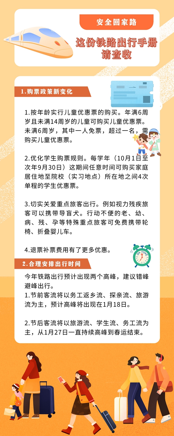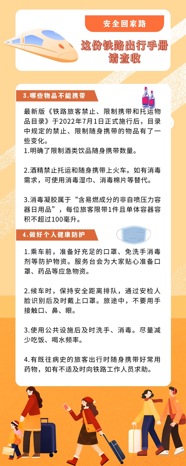 1月7日,為期40天的2023年春運(yùn)正式啟動(dòng)。從目前的車票預(yù)售情況看,今年的春運(yùn)客流高峰發(fā)送量或?qū)⑦_(dá)到2019年疫情前水平。鐵路出行有哪些注意事項(xiàng),哪些東西不能帶上火車?如何做好個(gè)人健康防護(hù)?這份出行手冊(cè)請(qǐng)查收。(新華社)