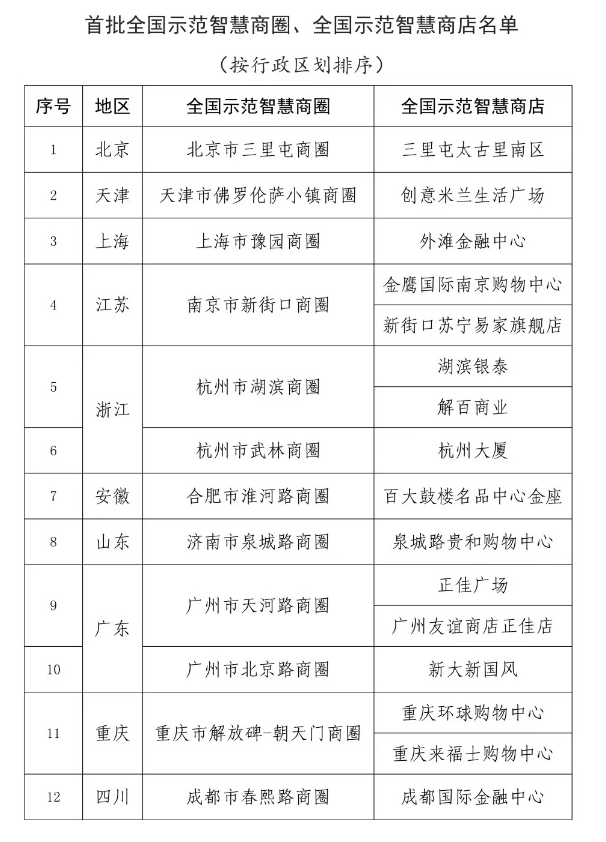 商務部1月9日對外公布,經地方培育、自主申報、專家評審和社會公示,商務部近日決定將北京市三里屯商圈等12個商圈和三里屯太古里南區(qū)等16個商店確認為“全國示范智慧商圈”和“全國示范智慧商店”,這是商務部公布的首批全國示范智慧商圈、全國示范智慧商店。