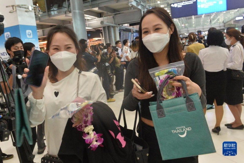 1月9日,泰國官員在位于泰國首都曼谷東郊沙沒巴干府的素萬那普機場歡迎搭乘廈門航空MF833的旅客。